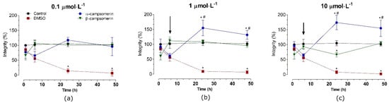 Toxicity of α-campsomerin and β-campsomerin on PC12 cell integrity. Cells were treated with peptides 0.1 μmol·L−1 (a), 1 μmol·L−1 (b) and 10 μmol·L−1 (c) for 1, 6, 12, 24, and 48 h. Control and DMSO groups represent cells without treatment and treated with DMSO 5%, respectively. Data were obtained from three independent experiments in triplicate, expressed as mean ± SD, and analyzed by one-way ANOVA followed by Tukey’s post-test. * p < 0.05 compared to the control group; # p < 0.05 compared to the β-campsomerin. Arrows indicate the integrity cells reduced by α-campsomerin, but not β-campsomerin, at 6 h of treatment.