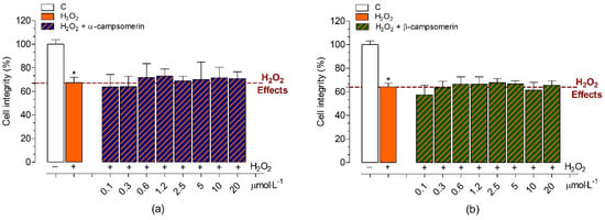 The neuroprotective effects against H2O2-induced oxidative stress in the presence of α-campsomerin or β-campsomerin under different concentrations were studied in PC12 cells (Figure 6). Initially, we evaluated the chronic cytotoxic effects promoted by H2O2 (concentrations varying between 1–0.06 mmol·L−1) on PC12 cells after 20 h of treatment. H2O2 promoted cell death at concentrations greater than 0.3 mmol·L−1 in a dose-dependent manner. The 0.5 mmol·L−1 concentration of H2O2 reduced 60.5 ± 4.0% of cell integrity and it was chosen for studies of protective effects of α-campsomerin or β-campsomerin against oxidative stress-induced neurotoxicity. Our results demonstrated that both peptides did not show neuroprotective effects against the H2O2-induced damage in PC12 cells after chronic treatment (Figure 6).