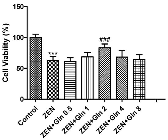 Effects of ZEN and Gln on the viability of the IPEC-J2 cells. Values are expressed as means ± SD of three independent experiments. *** p < 0.001 ZEN vs. control. ### p < 0.001 ZEN vs. ZEN + Gln 2.