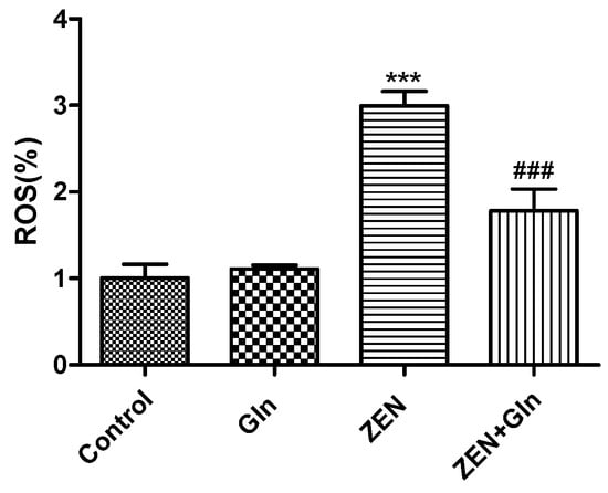 Effects of ZEN and Gln on intracellular ROS production. Values are expressed as means ± SD of three independent experiments. *** p < 0.001 ZEN vs. control. ### p < 0.001 ZEN vs. ZEN + Gln.