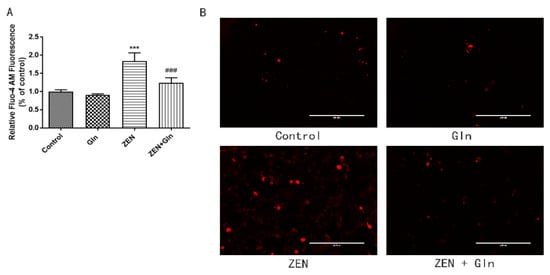 Effects of ZEN and Gln on intracellular Ca2+ production. (A) Values are expressed as means ± SD of three independent experiments. (B) Fluorescence microscopy observation of intracellular Ca2+ fluorescence intensity, Scale bar: 200 µm. *** p < 0.001 ZEN vs. control. ### p < 0.001 ZEN vs. ZEN + Gln.