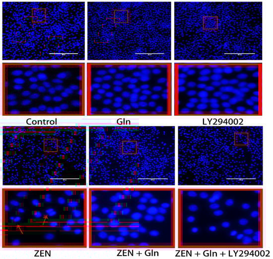 Effects of ZEN, Gln, and LY294002 on the apoptotic nuclei (Hoechst 33258 staining). The red color frame in the figure indicates the obvious change area. The arrow represents a change in nuclear morphology. Scale bar: 200 µm.