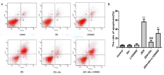 (A) The apoptotic cells were determined by annexin V-FITC/PI staining using flow cytometry. The Q1, Q2, Q3, and Q4, respectively, represented dead cells, the late cells apoptosis, normal cells, and the early cells apoptosis. Apoptosis was the sum of early apoptosis and late apoptosis. (B) The percentage of IPEC-J2 cells apoptosis was shown in statistical analysis. Each value represents the mean ± SD of the three independent experiments. *** p < 0.001 ZEN vs. control, ### p < 0.001 ZEN vs. ZEN + Gln. ^^ p < 0.01 ZEN + Gln vs. ZEN + Gln + LY294002.