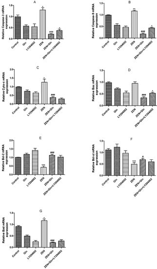 Effects of ZEN, Gln and LY294002 on the apoptosis-related genes in the IPEC-J2 cells. Values are expressed as means ± SD of three independent experiments. * p < 0.05, ** p < 0.01, and *** p < 0.001 ZEN vs. control. # p < 0.05 and ### p < 0.001 ZEN vs. ZEN + Gln. ^ p < 0.05 ZEN + Gln vs. ZEN + Gln + LY294002. (A) Effects of ZEN, Gln and LY294002 on the mRNA expression of Caspase-3; (B) Effects of ZEN, Gln and LY294002 on the mRNA expression of Caspase-9; (C) Effects of ZEN, Gln and LY294002 on the mRNA expression of Cyto-c; (D) Effects of ZEN, Gln and LY294002 on the mRNA expression of Bax; (E) Effects of ZEN, Gln and LY294002 on the mRNA expression of Bcl-2; (F) Effects of ZEN, Gln and LY294002 on the mRNA expression of Bcl-xl; (G) Effects of ZEN, Gln and LY294002 on the mRNA expression of Bad.