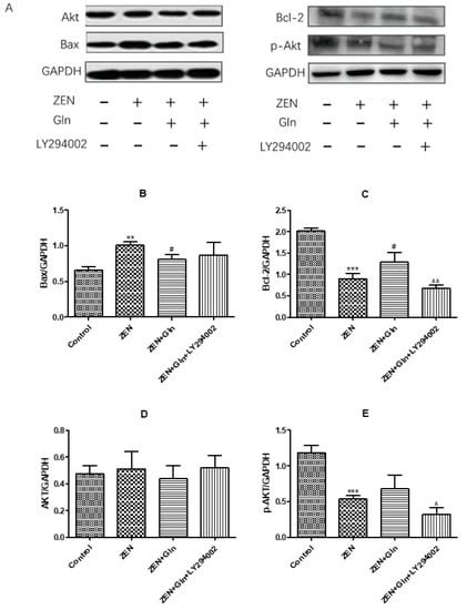 To further verify that the PI3K/Akt signaling pathway is the mechanism by which Gln protects against ZEN-induced apoptosis, the related proteins of the PI3K/Akt signaling pathway and apoptosis-related proteins were measured by western blotting. As shown in Figure 9, there was no difference in the protein expression of Akt in the four treatment groups (Figure 9D). Compared with the control group, after ZEN-exposed, the protein expression of pro-apoptotic gene Bax and anti-apoptotic gene Bcl-2 were significantly increased (p < 0.01) and significantly decreased (p < 0.001), respectively. The addition of Gln significantly decreased the protein expression of Bax compared with the ZEN group (p < 0.05), conversely, the protein expression of Bcl-2 was significantly elevated (p < 0.05). Compared with the ZEN + Gln group, the pretreatment of LY294002 significantly decreased the protein expression of Bcl-2 (p < 0.01), and there was no significant change in Bax protein expression. Also, as shown in Figure 9E, after ZEN-exposed, a remarkable decrease in the protein expression of the p-Akt compared with the control group, the addition of Gln increased the protein expression of p-Akt but did not reach a significant level. In addition, pretreatment with LY294002 significantly reduced p-Akt protein expression.