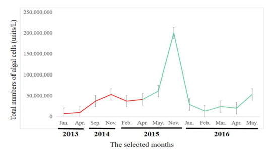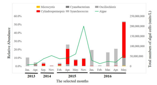 In recent years, MSR have experienced severe algal blooms (Supplementary Figure S1). Numbers of algal cells remained stable at about 6.8 × 106 to 6.1 × 107 units/L throughout the selected months and had a significant increase on November 2015 (Figure 1).