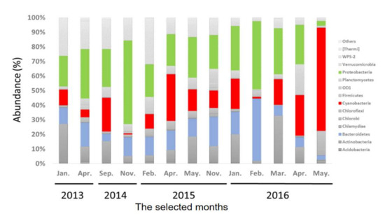To understand the temporal dynamics of bacterial communities in MSR, monthly random samples of water were collected during the study period. Diverse communities of bacteria were observed at the level of phylum (Figure 2). Even though there were slight differences among months, proteobacteria was the dominant phylum for all samples and contributed approximately 32% of the total OTU, followed by Cyanobacteria (18.9%), Bacteroidetes (14.1%), and Verrucomicrobia (11.5%). The 10 most prevalent phyla were Proteobacteria, Cyanobacteria, Bacteroidetes, Verrucomicrobia, Actinobacteria, Planctomycetes, Chloroflexi, OD1, Acidobacteria, Firmicutes, Chlorobi, Chlamydae, WPS-2, and others. Cyanobacteria represented the greatest proportion of phytoplanktonic communities in the detected bacterial community, which were composed primarily of species from five genera of Cyanobacteria, Cylindrospermopsis, Synechococcus, Oscillochloris, Microcystis, and Cyanobacterium (Figure 3). Microcystis and Cylindrospermopsis produce toxic extracellular products (Supplementary Figures S2 and S3) [25].