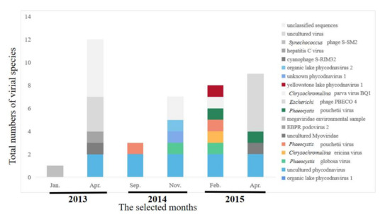 Six months of samples were selected to identify the viral communities, during which amounts of algae were relatively stable (Figure 1, highlighted in red). A total of 24,973,442 raw metagenomics reads were obtained, from which 1621 contigs were generated (>90 bp each) during the 6 months of MSR monitoring. The dominant family of viruses was Phycodnaviridae, which accounted for 70% of the total. Phycodnaviridae is considered to survive with algae as a host. Other viruses belonged to typical bacteriophage families, including: Myoviridae, Podoviridae, Flaviviridae, and Miniviridae. Metagenomics sequences were used to identify constituents of microbial communities at the species level of classification (Figure 4). The primary viruses included Organic lake Phycodnavirus 2, an unidentified Phycodnavirus 1, Yellowstone lake Phycodnavirus 1, Phaeocystis pouchetii virus 1, Phaeocystis pouchetii virus, Phaeocystis globosa virus, and uncultured Phycodnavirus, which belongs to the family Phycodnaviridae. The richness of viral species were significantly greater in spring, with values of 13.04 and 16.04 compared to those during other seasons (Figure 4). The compositions of viral species in the communities exhibited temporal variations. The greatest richness of species composition was found in spring. Species belonging to the Phycodnaviridae were abundant during autumn and winter.
