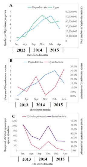 Relationships between Phcodnavirus and algae (A), Phycodnavirus and Cyanobacteria (B) and Proteobacteria and toxic Cyanobacteria of Cylindrospermopsis (C).