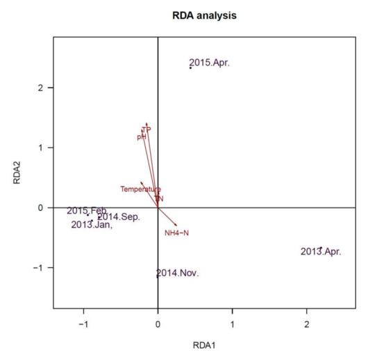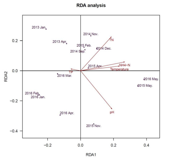 Furthermore, a cyclic pattern of relative abundances of microorganisms was observed in this study with Cyanobacteria mainly accumulated during spring and summer, which is consistent with results of other studies where significant microbial populations accumulated in a single season [36]. While microorganisms experience strong selection pressure under extreme conditions, they can still be clustered together, which illustrated that the survival of the species are strongly dependent on environmental conditions [37]. Alternatively, chemical and physical conditions can also drive changes in absolute and relative members of the microbial community over time [38]. Many of the microorganisms observed during this study had coexisted in this environment for a long time, and they also participate in a variety of physical and chemical reactions; therefore, environmental conditions can lead to changes in structure of the microbial community [39]. Based on results of the RDA analysis, pH and concentration of TP (TN/TP) were associated with the microbial community. This observation is in agreement with the results of other studies that showed influences of environmental factors [40]. Previous analyses revealed a significant correlation between structures of microbial communities and environmental factors, with pH being the most important. This is consistent with results found based on 16S rRNA gene sequences in previous studies, that pH was one of the most influential factors in structuring microbial communities [30,41]. In addition to pH, temperature also plays a role in shaping structures of communities of microorganisms [42]. Several previous studies have demonstrated that changes in temperature affect metabolism, production, respiration, and the growth efficiency of bacterial communities [43]. Another significant factor affecting bacterial communities during different seasons is organic matter, which has a strong impact on metabolism of microbes [44].