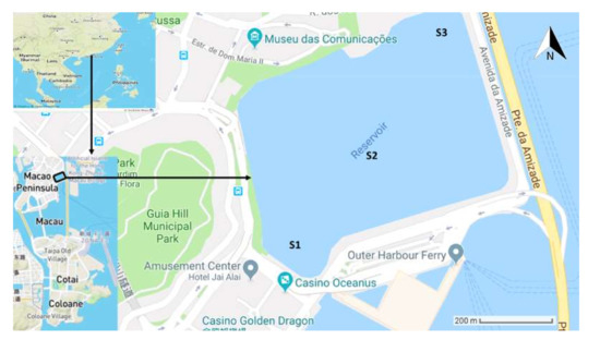 The water samples were collected during 2013–2016. Three sampling points were selected at three stations S1–S3 (Figure 8) in the reservoir. Stations S1, S2, and S3 are located in the inlet, center, and outlet of the reservoir, respectively. Samples were collected from 0.5 m below the surface at each station. Waters collected from S1, S2, and S3 were homogenized to represent one composite sample for each month. Samples were kept at −80 °C prior to analysis and extraction of DNA. Samples from January 2013, April 2013, September 2014, November 2014, February 2015, April 2015, May 2015, November 2015, January 2016, February 2016, March 2016, April 2016, and May 2016 were used for 16S rRNA sequencing. Samples of January 2013, April 2013, September 2014, November 2014, February 2015 and April 2015 were used for metagenomics sequencing. Macau Water Supply Co. Ltd. is responsible for monitoring and management of water-quality in the reservoir, which is the source of drinking water for Macau.