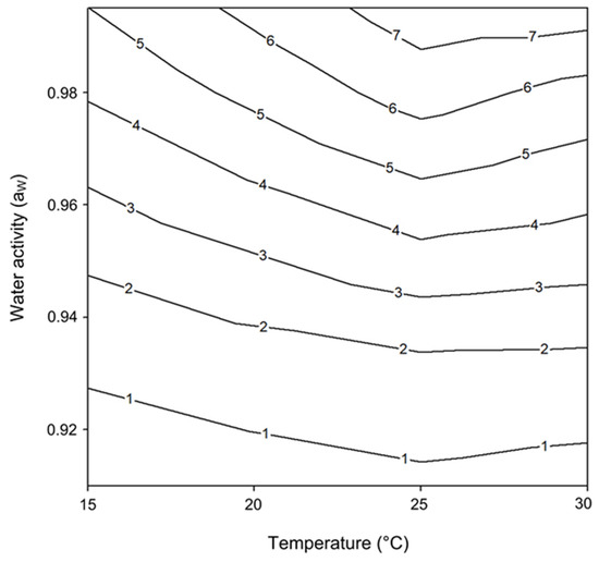 It is well known that fungal growth and mycotoxin production are a result of the complex interaction of several factors; thus, understanding each factor is essential to understand the overall process to predict and prevent mycotoxin development [10]. Water activity (aW) and temperature are the primary environmental factors that influence growth and mycotoxin production by several Fusarium species [11].
