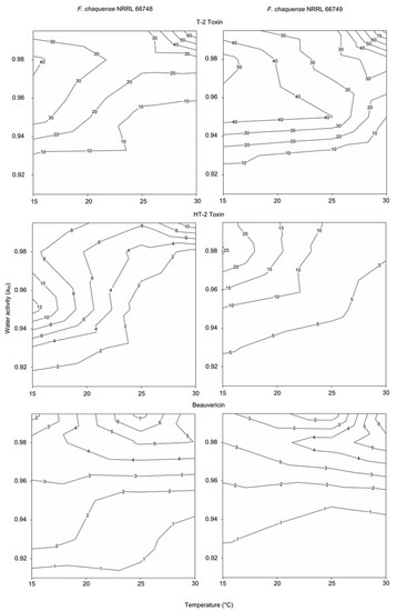 Figure 5 shows the two-dimensional contour maps obtained in order to identify the optimum conditions of aW, temperature and the range of conditions for the production of different amounts of mycotoxins by F. chaquense. Both strains of F. chaquense evaluated produced higher levels of T-2 at 0.995 aW and 30 °C. Moreover, both strains produced appreciable levels of T-2 at 0.98 aW and 15 °C. HT-2 showed the maximum level at 0.98–0.95 aW and 15 °C. Finally, for BEA, maximum levels were obtained at 0.98–0.995 aW and 25–30 °C.