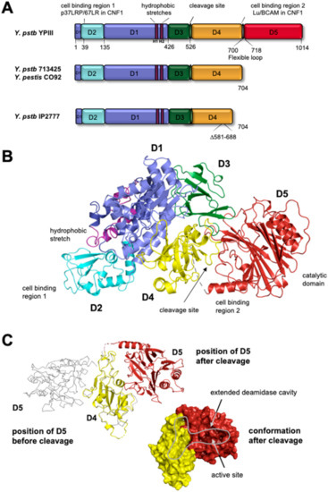 The comparison of the crystal structure of the cleaved, catalytically active CNFY D4-D5 fragment with the full-length CNFY toxin revealed that domain D4 changed its position with respect to D5, which liberated D5 from the semi-locked conformation seen in the full-length toxin (Figure 1C). This conformational change exposed the catalytic pocket, leading to a higher deamidation activity of the toxin [46].