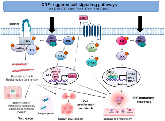 Multiple studies demonstrated that the CNFs trigger/manipulate numerous signaling pathways that are involved in crucial cell processes, such as the regulation of actin structures, immune responses, endocytosis, migration, cell cycles, and control of transcription (Figure 3).