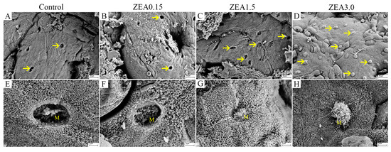 The M cells (yellow arrow) were more frequently found in the ZEA1.5 (Figure 2C) and ZEA3.0 (Figure 2D) treatments of ZEA than in the Control (Figure 2A) and ZEA0.15 treatments (Figure 2B). The microvilli of epidermal cells were damaged in the ZEA1.5 (Figure 2G) and ZEA3.0 (Figure 2H) treatments. Meanwhile, the M cells presented convex shape in the ZEA1.5 treatment, and the shape was more convex observed in the ZEA3.0 treatment.