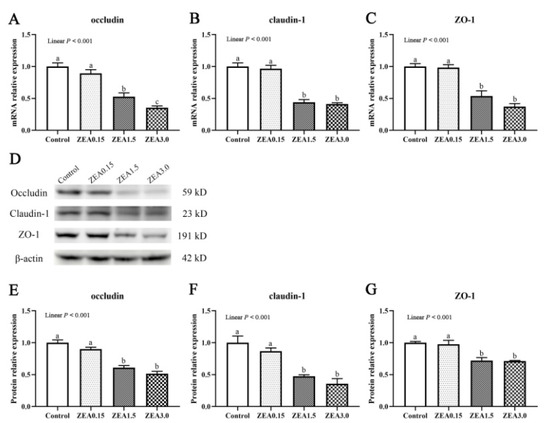 The protein expressions of occludin, claudin-1, and ZO-1 were also determined in the present study (Figure 5D–G). Pigs in the Control and ZEA0.15 groups had significantly higher protein expressions of occludin, claudin-1, and ZO-1 than pigs in the ZEA1.5 and ZEA3.0 groups (p < 0.05).
