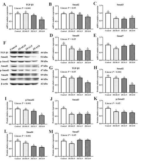The protein expressions of TGF-β1, Smad2, p-Smad2, Smad3, p-Smad3, Smad4, and Smad7 were also determined in the present study (Figure 6F–M). Different concentrations of ZEA had inconsistent effects on the protein expressions of TGF-β1 and Smads. The protein levels of TGF-β1, Smad2, and p-Smad2 in the ZEA3.0 treatment group were obviously lower than those in the Control, ZEA0.15, and ZEA1.5 treatment groups (p < 0.05). The protein levels of Smad3 and p-Smad3 in the ZEA0.15, ZEA1.5, and ZEA3.0 treatments significantly decreased (p < 0.05) compared with the Control treatment. The protein expressions of Smad4 in the ZEA1.5 and ZEA3.0 treatments were obviously lower than those in the Control and ZEA0.15 treatments (p < 0.05). The protein expression of Smad7 in the ZEA0.15 treatment was significantly lower than that in the Control, ZEA1.5, and ZEA3.0 treatments (p < 0.05).