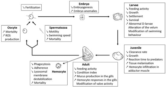 - Le Goïc, N.; Hégaret, H.; Fabioux, C.; Miner, P.; Suquet, M.; Lambert, C.; Soudant, P. Impact of the toxic dinoflagellate Alexandrium catenella on Pacific oyster reproductive output: Application of flow cytometry assays on spermatozoa. Aquat. Living Resour. 2013, 26, 221–228. [Google Scholar] [CrossRef]