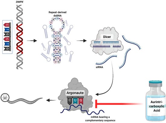 Proposed mechanism of the pathogenicity of repeat expansion disorders. RNA transcribed from the expanded DNA repeats creates hair-pin structures that accumulate in foci. These double-stranded RNAs are processed by Dicer to short-interfering RNA (siRNA). The siRNAs engage the downstream RNA interference components to silence genes bearing complementary sequences. Administration of aurintricarboxylic acid may disrupt this interaction. Created with BioRender.com (Accessed 3 November 2021).