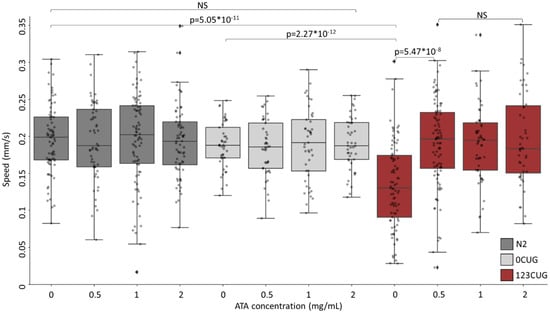 We utilized a C. elegans experimental system of expanded repeats. The C. elegans strains express green fluorescent proteins (GFP) bearing 0 or 123 repeats of CTG (0CUG and 123CUG, respectively) in the 3′ UTR, under the regulation of the myo-3 muscle-specific promotor [6,7,10]. Phenotypically, the toxicity induced by the expanded repeats manifests itself in motility impairment, expressed as slower crawling speeds in affected nematodes. Hence, we first examined the effect of ATA administration on nematode motility. We grew N2, 0CUG, and 123CUG nematodes on NGM plates with increasing doses of ATA (0 mg/mL, 0.5 mg/mL, 1 mg/mL, and 2 mg/mL). On day two of adulthood, we filmed the treated nematodes and measured their crawling speed (Figure 2). The 123CUG untreated nematodes exhibited severely impaired motility with an average speed of 0.14 mm/s as compared with the 0CUG and N2 groups, which both measured an average speed of 0.19 mm/s. Treatment of 0.5 mg/mL ATA achieved full rescue of motility impairment in 123CUG nematodes, with an average moving speed of 0.19 mm/s. The increased doses of 1 mg/mL and 2 mg/mL had the same effect. Importantly, ATA treatment did not affect motility in 0CUG and N2 control nematodes, in any of the studied concentrations.