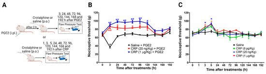 Effect of crotalphine in the mechanical nociceptive threshold of sensitized and non-sensitized rats. (A) Schematic representation of treatment and rat paw pressure test. (B) PGE2 (100 ng/paw) was injected 2 h before the oral crotalphine administration and nociceptive threshold was assessed before (0) and 3, 24, 48, 72, 96, 120, 144, 168 and 198 h after the PGE2 injection. Data are presented as mean ± SEM. * significantly different from baseline. # significantly different from the saline + PGE2 group, n = 6 per group (p < 0.05). (C) Nociceptive threshold was obtained before (0) and 1, 3, 5, 24, 48, 72, 96, 120, 144, 168 and 198 h after the oral administration of crotalphine. Data are presented as mean ± SEM. * significantly different from the saline group, n = 5 per group (p < 0.05). The observer was blinded to the experimental conditions.