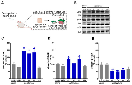 2.2. Crotalphine Increases the Spinal ERK and JNK and Decreases p38 Activation