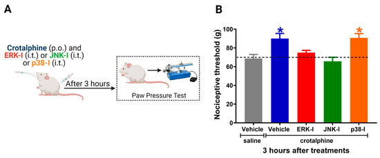 ERK1/2 and JNK inhibitors prevent crotalphine-induced analgesia. (A) Schematic representation of the experimental procedure. (B) Nociceptive threshold was assessed in the rat paw pressure test before (0) and 3 h after systemic administration of crotalphine (1 µg/kg) with concomitant intrathecal injection of the ERK inhibitor (ERK-I, 30 µg/30 µL), JNK inhibitor (JNK-I, 30 µg/30 µL) or p38 inhibitor (p38-I, 30 µg/30 µL). Data represents mean values ± SEM. * significantly different from baseline (dotted line), n = 6 per group (p < 0.05). The observer was blinded to the experimental conditions.