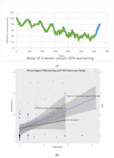 The Pearson correlation between worsening (in %) and delay (in days) in CD patients (y = 0.6x + 5; r = 0.48; p < 0.05) was almost identical to the correlation between worsening and delay in non-CD patients (r = 0.54; p < 0.01; Figure 1b). This was true for both patients’ and the treating physician´s rating.