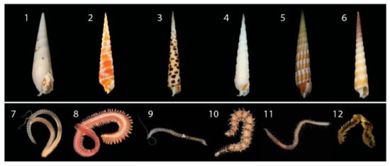 Representative venomous terebrid snails and their annelid prey identified in this study. (1) Hastula hectica. (2) Myurella nebulosa. (3) Terebra subulata. (4) Terebra argus. (5) Myruellopsis undulata. (6) Terebra guttata. (7) Scolelepis. (8) Neanthes. (9) Pygospio. (10) Odontosyllis. (11) Syllis. (12) Worm pulled from the mouth of Terebra guttata (6), identified as Scolelepis. Photo credits available online: https://www.aphotomarine.com (accessed on 29 January 2021).