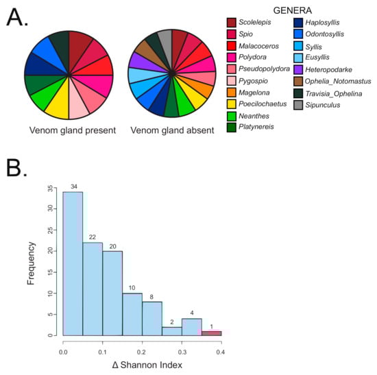The Kruskal Wallis non-parametric test was performed on all 71 specimens and the result indicated a significant difference of diet breadth between terebrid specimens with and without venom apparatus (p < 0.01). Specifically, terebrid specimens with a venom gland present had a more restricted diet (12 annelid genera recorded) than terebrid species without a venom gland (16 annelid genera recorded) (Figure 3A). A randomization test of all 71 specimens was conducted to further corroborate the results of the Kruskal Wallis non-parametric test. The difference between the Shannon diversity indices observed for the samples with the presence (1.91) and absence of a venom apparatus (2.26) was calculated and found to be 0.352. Observations were then randomized by column 100 times and the differences in Shannon indices were recalculated. Our data produced the greatest difference in Shannon index (p < 0.01), supporting the finding that terebrid species without a venom gland had a greater diversity of annelid diet (Figure 3B).