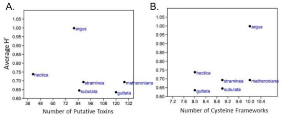 A small variation in the number of cysteine frameworks, ranging from 8 to 10 cysteines, was instead detected among the examined terebrid species (Figure 4B). Hastula hectica showed the lowest venom complexity while Hastula matheroniana showed the highest. Plots of the average species Shannon index against the number of teretoxins and cysteine frameworks did not produce any quantitative statistical results, indicating there is no direct correlation between terebrid venom complexity and diet (Figure 4).