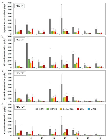 Mean concentrations (±SD) of DON, DON3G, 3+15-AcDON, ZEN, and α-ZEL (µg/kg) in forage maize samples of four different cultivars (Cv I–IV) (a–d) at eight trial locations (L1–L8). DON = deoxynivalenol; DON3G = deoxynivalenol-3-glucoside; 3+15-AcDON = sum of 3- and 15-acetyl-deoxynivalenol; ZEN = zearalenone; α-ZEL = α-zearalenol. n = 120.