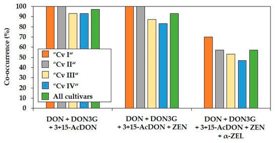 Regarding different combinations of co-occurring mycotoxins, DON and its related forms DON3G and 3+15-AcDON co-occurred as the most frequent triple combination of mycotoxins in 97% of all forage maize samples (Figure 3), demonstrating a strong co-occurrence of DON and its modified forms. The most frequent mycotoxin combination with a minimum of four co-occurring mycotoxins was the combination of DON + DON3G + 3+15-AcDON + ZEN, being present in 93% of all samples ranging from 83 to 100% between the four cultivars. Together with α-ZEL, these four Fusarium mycotoxins represented the most frequent combination of five co-occurring mycotoxins in all samples with a percentage of 57%. The maximum combination of six mycotoxins containing DON, ZEN, DON3G, 3+15-AcDON, α- and β-ZEL was detected in 28% of all samples (Figure 2).