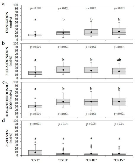 Boxplots and means (black rhombus) of ratios between (a) DON3G and DON, (b) 3+15-AcDON and DON, (c) 3+15-AcDON + DON3G and DON, (d) α-ZEL and ZEN (mol%) in forage maize samples of four different cultivars (Cv I–IV). Five statistics are represented in each boxplot from bottom to top: the smallest observation, lower quartile, median, upper quartile, and largest observation, respectively. Different letters describe significant differences between cultivars for each ratio (p ≤ 0.05). The p-values describe significant or insignificant differences of mean ratios from zero. DON = deoxynivalenol; DON3G = deoxynivalenol-3-glucoside; 3+15-AcDON = sum of 3- and 15-acetyl-deoxynivalenol; ZEN = zearalenone; α-ZEL = α-zearalenol. n = 120.