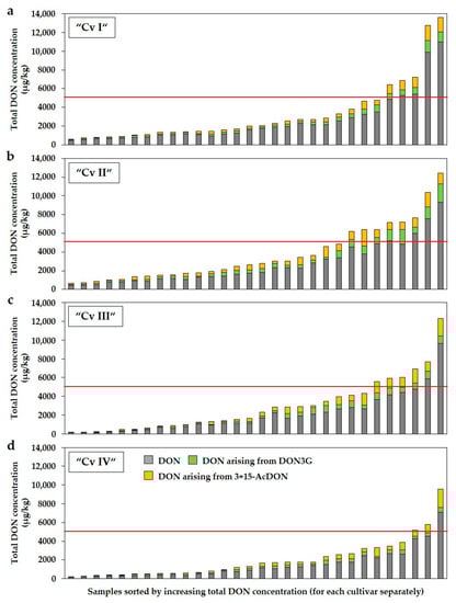 Total DON concentrations (µg/kg) in forage maize samples of four different cultivars (Cv I–IV) (a–d) by considering DON3G and 3+15-AcDON. The concentration of DON + DON3G + 3+15-AcDON of each sample was calculated by adding up all concentrations of the measured DON and DON arising from DON3G and 3+15-AcDON assuming a total conversion of DON3G and 3+15-AcDON into parent DON. For the determination of DON concentrations arising from DON3G and 3+15-AcDON concentrations of DON3G and 3+15-AcDON were normalised to the molecular mass of DON. Samples were sorted by increasing concentration of DON + DON3G + 3+15-AcDON for each cultivar separately. The guidance value for DON in complementary and complete feeding stuffs (5000 µg/kg) [27] is shown as red line. DON = deoxynivalenol; DON3G = deoxynivalenol-3-glucoside; 3+15-AcDON = sum of 3- and 15-acetyl-deoxynivalenol. n = 120.