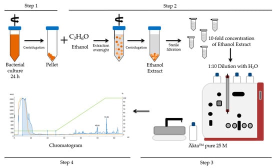 On the next day, the suspension was centrifuged for 12 min at 8600× g at room temperature and filtered through a 0.2 µm PTFE filter (polytetrafluorethylen; Phenomenex, Aschaffenburg, Germany). The remaining extract was aliquoted to 2 mL and stored at −20 °C until use. The extracts were concentrated 10-fold using a concentrator with an integrated vacuum pump (Eppendorf, Hamburg, Germany) at 45 °C for about 1 h, and extracts from the same strain were pooled to a final volume of 1 mL.