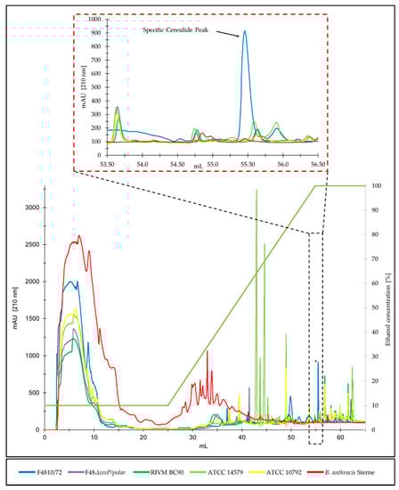 The respective RPC fractions that eluted after 55.5 ± 0.1 mL, and showed the cereulide specific signal in the ethanol extracts of the emetic strains, were collected from all strains included in the study and subjected to UPLC-MS/MS [33] to confirm the specificity of the corresponding chromatographic signal for cereulide (see Section 2.3).