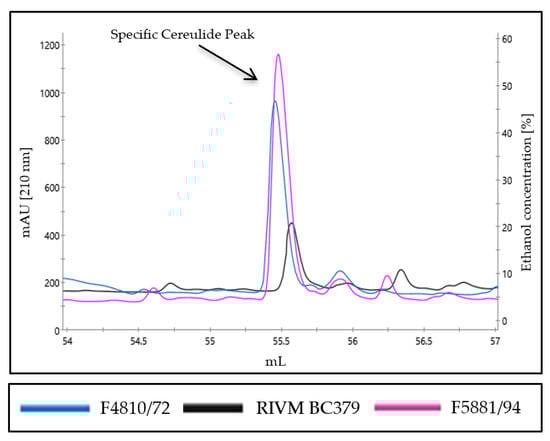 To test this hypothesis, we next analyzed two additional emetic B. cereus strains, one high (F5881/94), and one low, cereulide producer (RIVM BC379) [34]. As depicted in Figure 3, extracts of both strains showed the prominent peak at 55.5 mL, highlighting the specificity of this peak. Notably, the high cereulide producer strain F5881/94 exhibited a higher peak than the medium toxin producer strain, F4801/72, while the peak of the low cereulide producer (RIVM BC379) was even lower than the peak of F4801/72, indicating that our method may be used for relative quantification and classification of emetic strains (see Table 2).