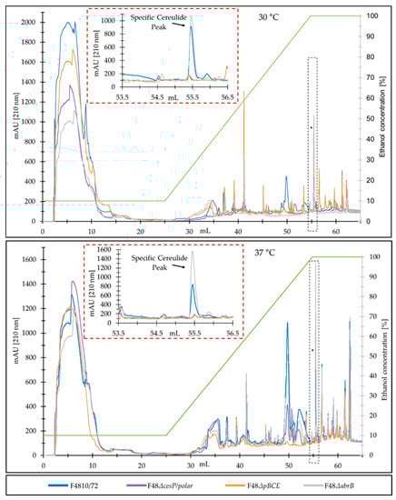 Next, we tested the suitability of our new RPC method for a rapid analysis of the cereulide production capacities of mutant strains, as this allowed for a relative quantification of cereulide. To this end, two cereulide deficient mutant strains, one cereulide overproducing mutant and the parental strain F4810/72 were grown in LB broth, with rotary shaking at 120 rpm, for 24 h, at 30 °C and at 37 °C. Samples were processed as described above. As expected, RPC of the respective ethanol extract from the mutant strains revealed that the peak at 55.5 mL was absent in the cereulide-deficient mutants F48∆cesP/polar and F48∆pBCE, while it was higher in the cereulide-overproducing mutant F48∆abrB compared to the parental F4810/72 (Figure 4), reflecting the previously reported upregulated cereulide production in this mutant strain [40].