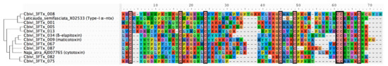 Protein sequences for major toxin families (3FTx, Kunitz, and PLA2) were downloaded from the UniProt database [101]; protein clustering and phylogenetic analyses were used to select a subset of sequences that represent the diversity of each family. These were then combined with the translated sequences from our C. bivirgatus transcriptome. The sequences were aligned using a combination of manual alignment of the conserved cysteine positions and alignment using the MUltiple Sequence Comparison by Log-Expectation (MUSCLE) algorithm implemented in AliView 1.18 for the blocks of sequence in between these sites [107,108]. We reconstructed the phylogeny of these sequences using MrBayes 3.2 for 15,000,000 generations and 1,000,000 generations of burnin with lset rates=invgamma (allows rate to vary with some sites invariant and other drawn from a distribution) and prset aamodelpr=mixed (allows MrBayes to generate an appropriate amino acid substitution model by sampling from 10 predefined models) [110]. The runs were stopped when convergence values reached 0.01. Nexus files containing the full alignments, MrBayes settings, and output tree can be found in the Supplementary Materials. The results were visualized using Figtree v1.4.3 [111].