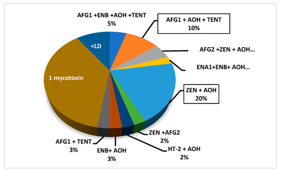 The co-presence of mycotoxins in a single sample could be a health concern due to the exposure of consumers to multiple fungal metabolites, which might exert greater toxicity than the exposure to a single one. The multi-mycotoxin occurrence in food and feed could be associated with health and reproductive disorders, lower performance in animals, and higher medical costs [36]. Concerning the mycotoxins’ co-occurrence in AMP samples, this happened in 52% of samples. Figure 1 summarizes the data obtained on the multi-contamination of AMP samples, revealing that the ZEN + AOH combination was the most commonly present (20%).