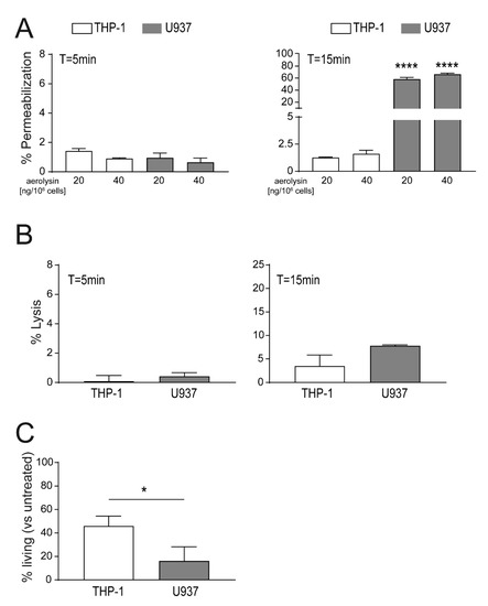 2.2. Localization of Aerolysin Differs in U937 Versus THP-1 Cells and Causes Rapid Permeabilization of U937 Cells