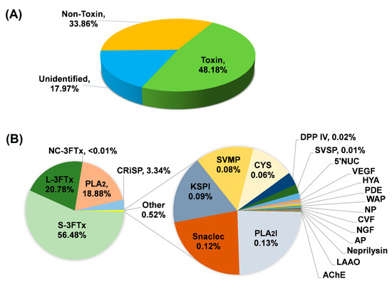 Based on BLASTx search, the transcripts were assigned into three categories: (a) “Toxin”; (b) “Non-toxin”; and (c) “Unidentified” (Figure 2A; Table 1). Transcripts in the “Toxin” category encoded known and putative snake toxins; these constituted the venom-gland transcriptome by a total FPKM of 48.18%. The remaining portion of the transcriptome was shared between “Non-toxin” transcripts, which represent cellular or house-keeping genes (33.86% of the total FPKM) and transcripts with no identifiable hits from the BLASTx search (17.97% of total FPKM). The venom-gland transcriptome of H. curtus was dominated (virtually 50%) by transcripts with toxin annotation, reflective of the specialized toxin-secreting function of the gland tissue. The high expression of “genes for toxins” is comparable to previous findings in other terrestrial elapid snakes, including cobras (Naja spp.) [21,22], king cobra (Ophiophagus hannah) [23] and Micrurus spp. (American coral snakes) [24,25], where toxin transcripts accounted for more than 40% of the venom-gland transcriptomes.