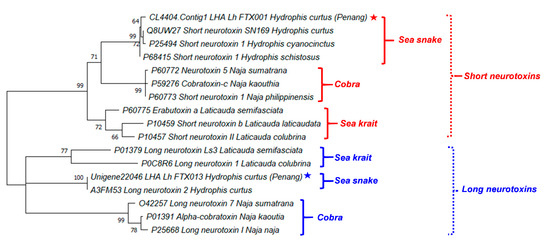 A phylogenetic tree of short and long neurotoxins from representative species of sea snakes, sea kraits and cobras. Stars indicated the major short and long neurotoxins derived from de novo venom-gland transcriptome of Hydrophis curtus, Penang. Tree was constructed with PAM model of Dayhoff and bootstrapping was performed with 1000 replicates on MEGA Version X [35]. Numbers indicate branch support values. Red/blue stars indicate the specimen studied in this work.