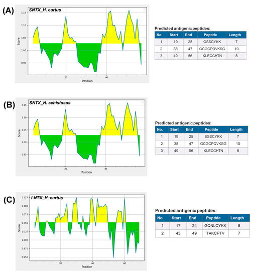 Predicted antigenicity of alpha-neurotoxin proteins from Hydrophis curtus and Hydrophis schistosus with Kolaskar and Tongaonkar method [45]. (A) Short neurotoxin, H. curtus, accession: Lh_FTX001. (B) Short neurotoxin, H. schistosus, accession: P68415. (C) Long neurotoxin, H. curtus, Lh_FTX013. Yellow areas corresponded to antigenicity score above threshold (1.024) proposed to be part of B-cell epitope.