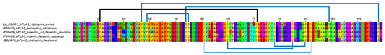 Multiple sequence alignment of the major phospholipase A2 (PLA2, Lh_PLA01) of Hydrophis curtus (Penang) and related sequences. The PLA2 shared highly conserved cysteine residues and seven disulfide bridges. Blue lines: conservative disulfide bonds; black lines: additional disulfide bond for Group IA PLA2.