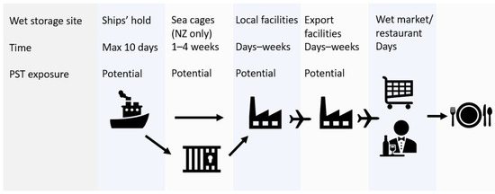 Wet storage times may range from a few days to several weeks depending on the time of year and market demands. If PST-producing algal blooms are present in coastal waters, these algae will be inadvertently pumped into holding compartments on-vessel, in sea cages (New Zealand only), or in local/export holding facilities. As a result, J. edwardsii may be exposed to PST in the supply chain, post regulatory monitoring programs.