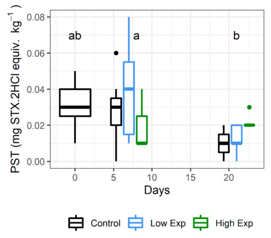 PST concentrations in the hepatopancreas of J. edwardsii lobsters harvested on days 0, 7 and 21 after exposure to 0, 1 × 105 or 2 × 105 cells of A. catenella per litre of tank water (control, low, or high exposure groups respectively). Days where the PST concentration is not significantly different share the same letter. STX: saxitoxin.