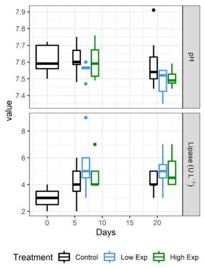 Of the range of electrolytes, minerals, metabolites, and enzymes examined, only pH and lipase showed any significant difference between treatments (Figure 4). The low exposure treatment group showed significantly lower pH than the control group (p value = 0.02), whilst both low and high exposure groups showed significantly higher lipase concentrations than the control group (p value = 0.03 and 0.02, respectively).